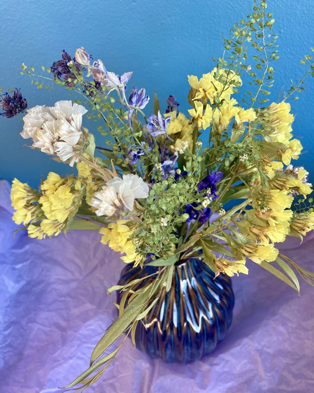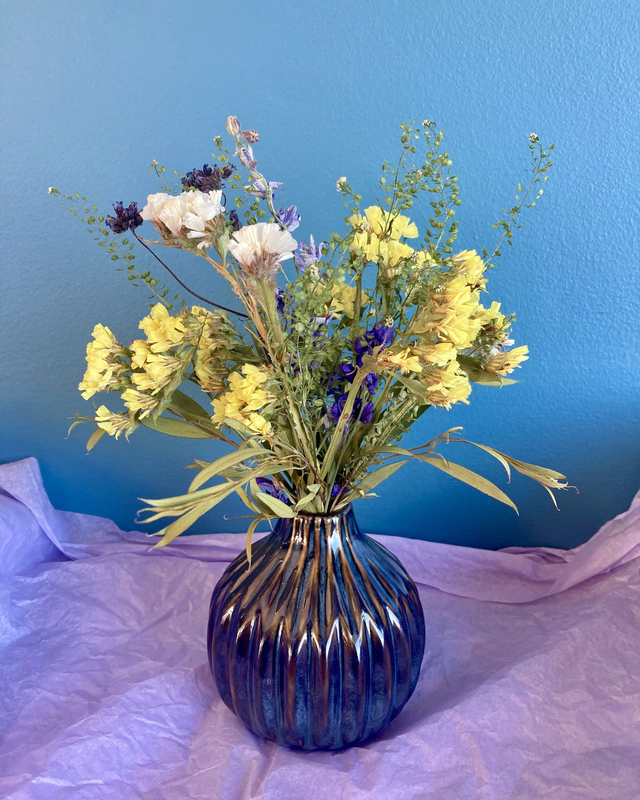 An elegant, colourful arrangement containing a mix of dried flowers, foliage and seed heads in a vintage style, dark blue, glazed, bulb-shaped vase. A lovely gift for someone special, or a treat to brighten up the house through winter. The perfect Christmas gift for anyone who has enough "stuff" and is sustainability conscious.
