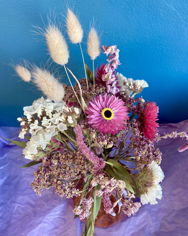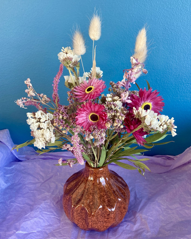 An elegant, colourful arrangement containing a mix of dried flowers, foliage and seed heads in a vintage style, rusty brown, glazed, fluted bulb vase. A lovely gift for someone special, or a treat to brighten up the house through winter. The perfect Christmas gift for anyone who has enough "stuff" and is sustainability conscious.