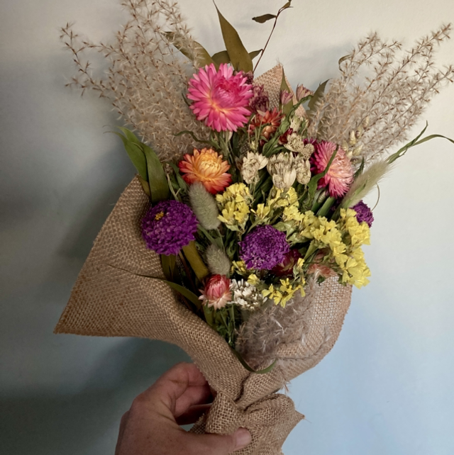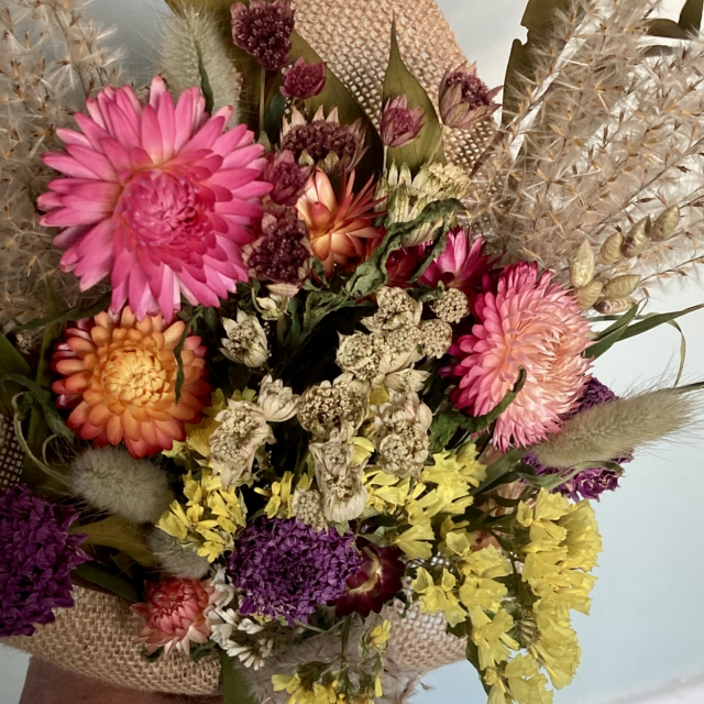 An elegant, colourful bouquet containing a mix of dried flowers, foliage and seed heads and wrapped in vintage style hessian. A lovely gift for someone special, or a treat to brighten up the house through winter. The perfect Christmas gift for anyone who has enough "stuff" and is sustainability conscious.